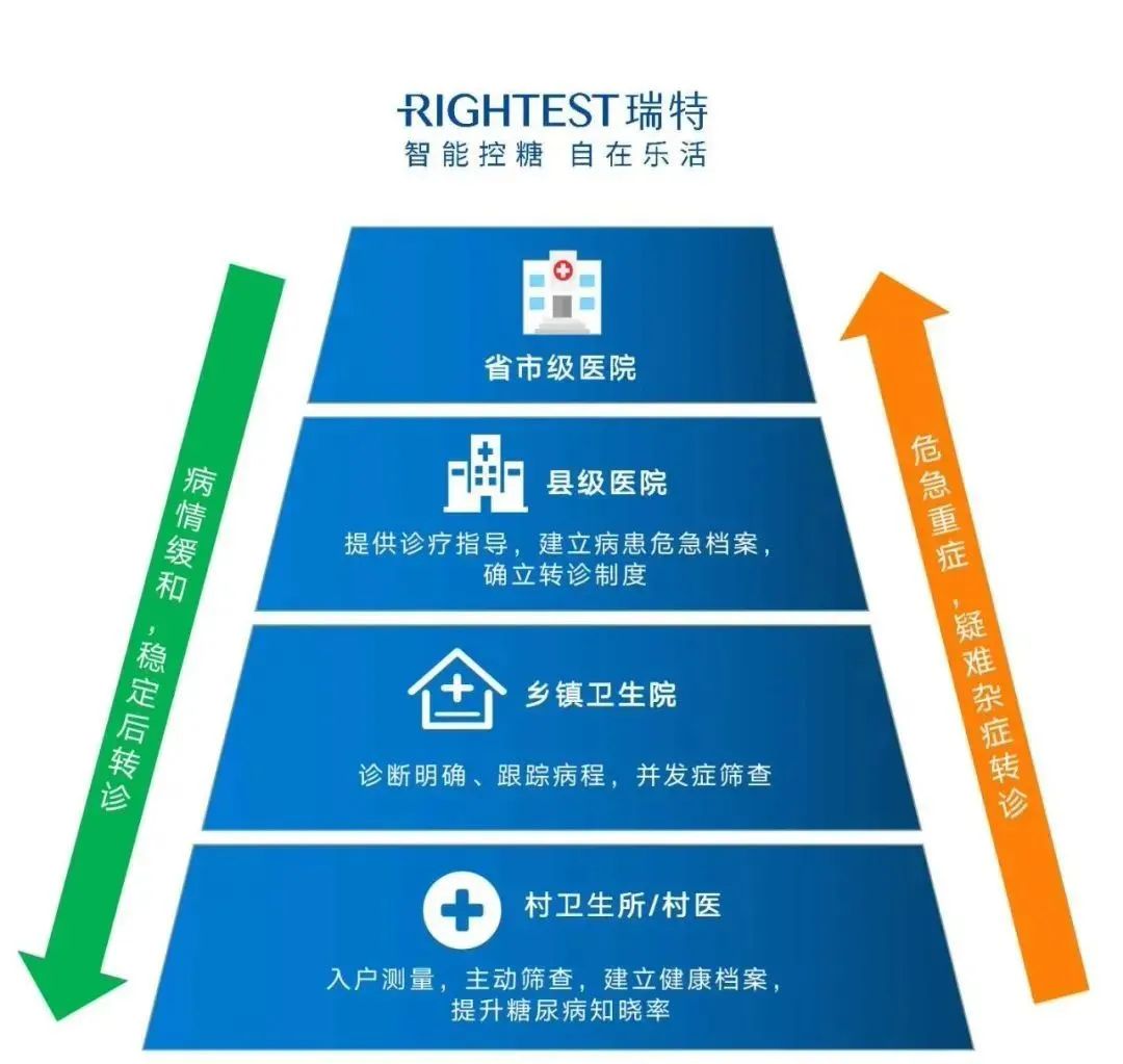 如今,在與華廣瑞特的緊密合作之下,該縣域龍頭醫(yī)院的糖尿病專(zhuān)科得到了長(zhǎng)足的發(fā)展,不僅得到了上級(jí)部門(mén)和社會(huì)各界的認(rèn)可,還得到了當(dāng)?shù)乩习傩盏母叨荣澴u(yù)。與此同時(shí),當(dāng)?shù)亻_(kāi)辟了一套以縣中醫(yī)院為龍頭、十一家鄉(xiāng)鎮(zhèn)衛(wèi)生院為樞紐、村衛(wèi)生室為基礎(chǔ)的縣鄉(xiāng)一體化的醫(yī)共體模式,切切實(shí)實(shí)提高了當(dāng)?shù)芈』颊叩闹獣月省⒃\斷率、干預(yù)率,各級(jí)鄉(xiāng)、鎮(zhèn)、村衛(wèi)生院也已基本能夠?qū)崿F(xiàn)“大病不出縣,小病不出鄉(xiāng)”的目標(biāo)。