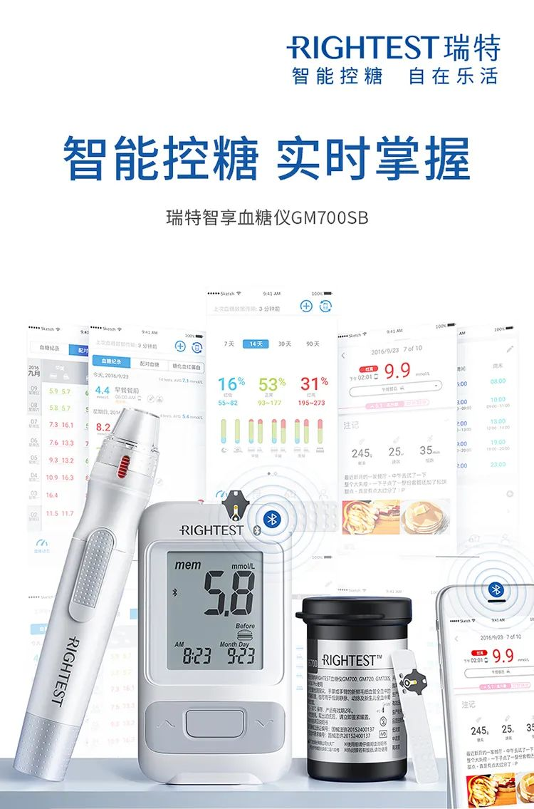 第五:智能性,可實時將血糖數據同步至瑞特健康APP或小程序;擁有智能測糖提醒功能;支持查看7/14/30/90天的趨勢圖表,還可分析血紅蛋白數據;記錄控糖日記、學習控糖知識等,幫助患者實現高效血糖健康自我管理。