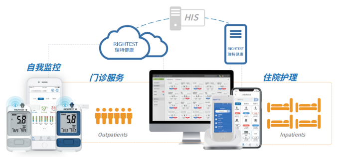 瑞特與國內外眾多醫院合作,積極思考與應對血糖監測管理的問題,構建以瑞特全方位血糖管理系統為基礎的血糖生態管理閉環。投入院內外一體化血糖管理系統、血糖檢測智能終端、瑞特健康APP與小程序等軟硬設備,建立多個以患者為核心的全院血糖管理中心,從面向醫院的“智慧管理”、面向醫務人員的“智慧醫療”、面向患者的“智慧服務”3個維度,深度融合門診、住院、出院、居家全場景全流程血糖管理,完成診前、診中、診后場景全覆蓋。
