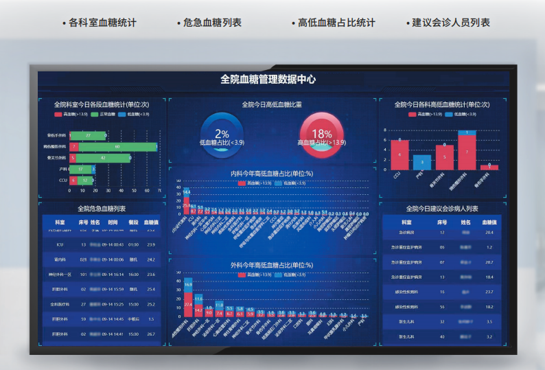 系統(tǒng)通過血糖數(shù)據(jù)中心大屏展示,對每日各科室病患血糖情況一目了然,可實時監(jiān)測管理高低血糖患者,對于危急值進行預(yù)警,及時會診,為患者制定個體化方案、血糖控制目標及隨訪計劃;使每位患者的血糖水平得到有效控制,以減少因糖代紊亂所致的相關(guān)疾病死亡率、感染等,縮短術(shù)前等待時間、住院時間。節(jié)省醫(yī)療資源,提升醫(yī)療服務(wù)效率與質(zhì)量,通過創(chuàng)新手段增強醫(yī)生的服務(wù)效能,確?;颊攉@得更高品質(zhì)的診療體驗與滿意度。