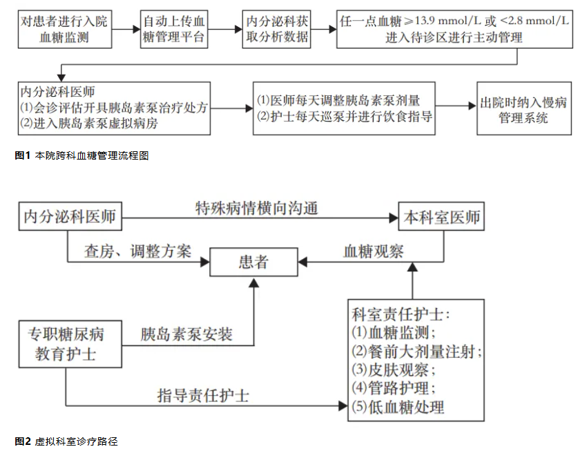 (1)“虛擬病房”的設立:利用血糖管理系統(瑞特全方位血糖智能管理系統,中國)及 HIS,建立“待診虛擬病房”和“科外泵虛擬病房”。
