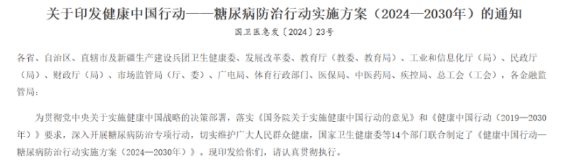 今年7月,國家衛(wèi)生健康委等14個部門聯(lián)合制定并發(fā)布了《健康中國行動——糖尿病防治行動實施方案(2024—2030年)》(簡稱“實施方案”),明確了2024年至2030年糖尿病防治工作的總體要求,提出要堅持預(yù)防為主,創(chuàng)新醫(yī)防融合機制,形成有利于糖尿病防治的生活方式、生態(tài)環(huán)境和社會環(huán)境,降低因糖尿病及其并發(fā)癥導(dǎo)致的死亡和傷殘,提升人民群眾健康素養(yǎng)水平。實施方案特別提出,要實施重大科技攻關(guān),加快創(chuàng)新成果轉(zhuǎn)化,支持新技術(shù)、新產(chǎn)品在糖尿病防治領(lǐng)域推廣應(yīng)用。