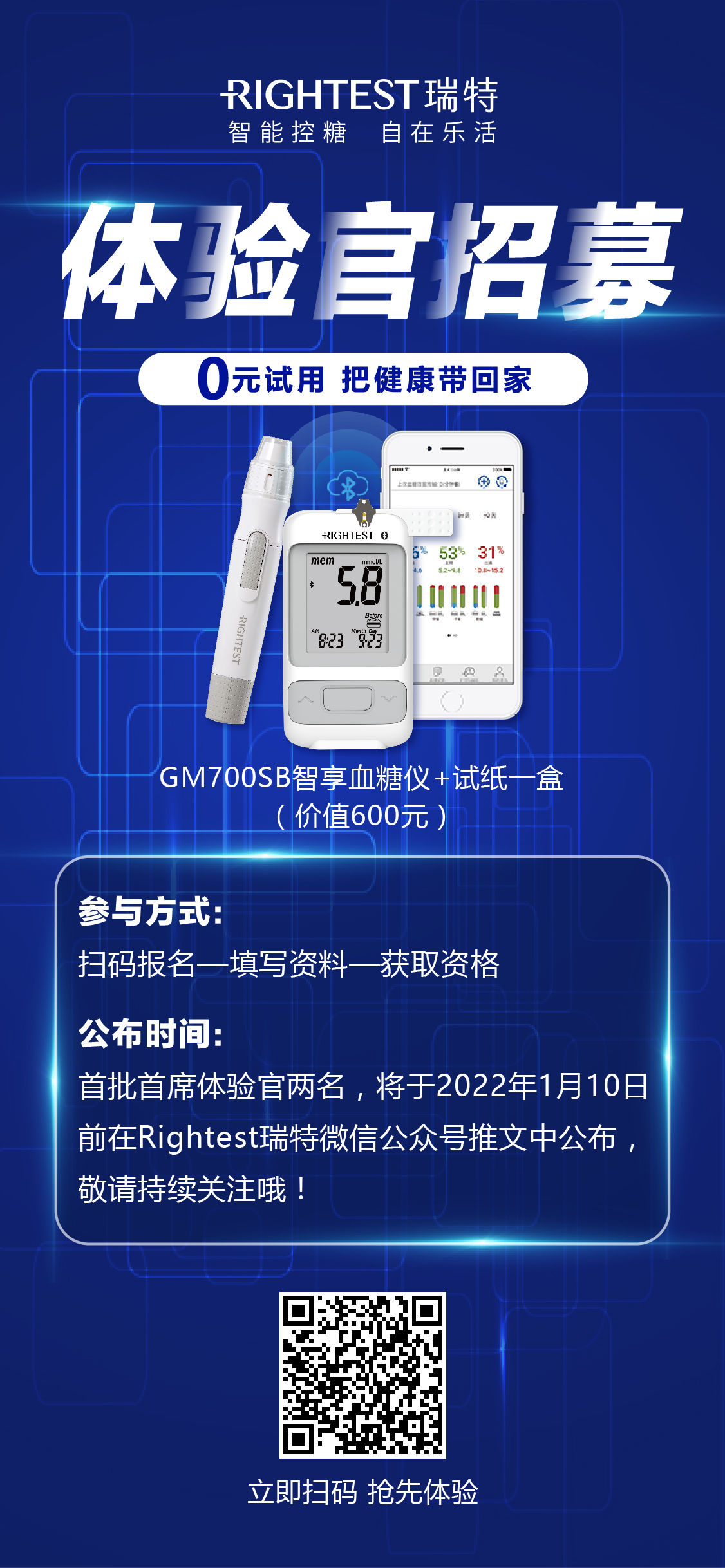 掃碼識別上方活動海報二維碼或者點擊“體驗官招募 | 瑞特血糖儀免費試用等你來!”