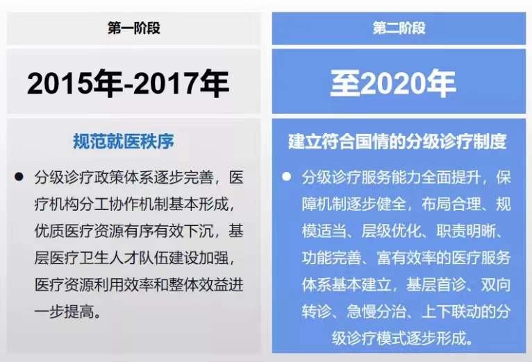 我國的醫(yī)療資源長期以來集中于三級醫(yī)院,基層醫(yī)療資源匱乏,醫(yī)療資源分配不均衡的問題日益突出。為降低龐大的醫(yī)療支出,幫助居民建立正確的就醫(yī)觀念;提高醫(yī)療效率,讓病患在就醫(yī)的時減少不必要的傷害,2015年國務(wù)院辦公廳發(fā)布了《關(guān)于推進(jìn)分級診療制度建設(shè)的指導(dǎo)意見》,為指導(dǎo)各地推進(jìn)分級診療制度建設(shè),圍繞總體要求、以強基層為重點完善分級診療服務(wù)體系、建立健全分級診療保障機制、組織實施等四方面提出:分兩步走的分級診療制度建設(shè)目標(biāo),到2017年,分級診療政策體系逐步完善;到2020年,基本建立符合國情的分級診療制度,并計劃在“十三五”期間基本實現(xiàn)。